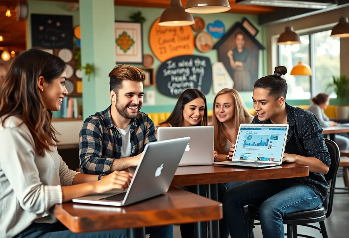 AHSTW students working on social media marketing in a local cafe.