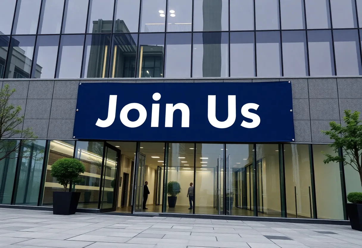 Corporate office building with a 'Join Us' banner