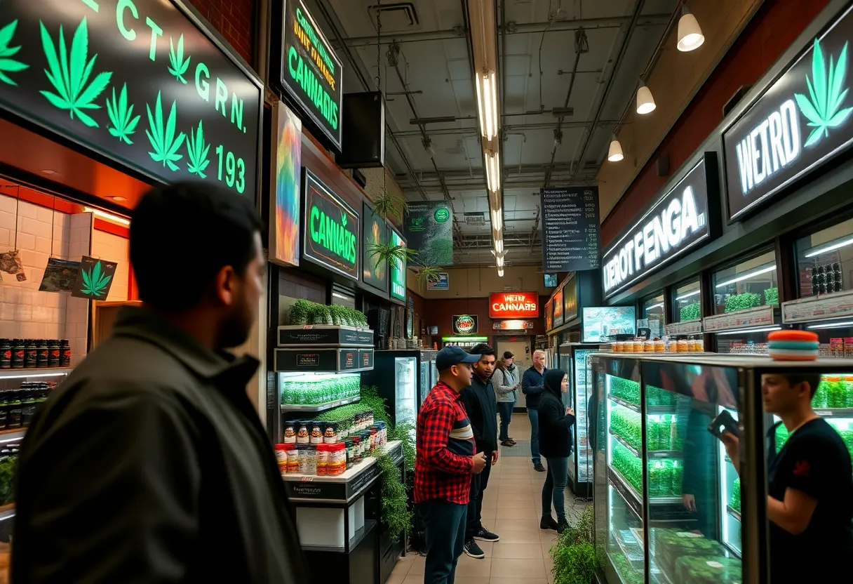 A bustling dispensary in Detroit showcasing various cannabis products.