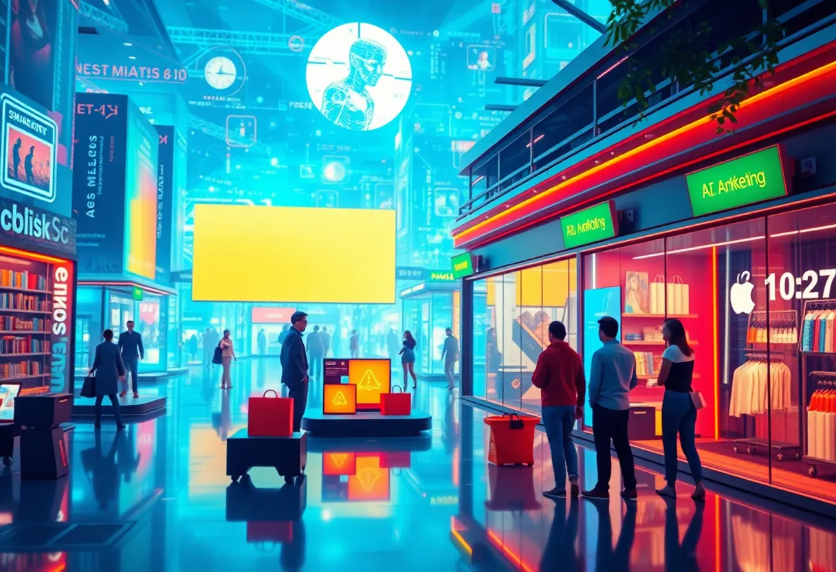 Illustration of future digital marketing trends including AI, AR, and social shopping.