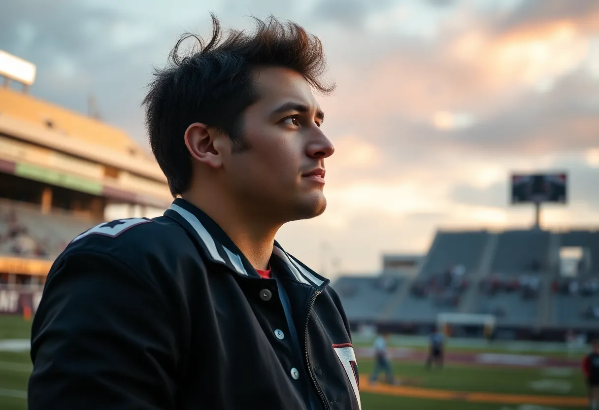 A college football player wearing a varsity jacket in a stadium.