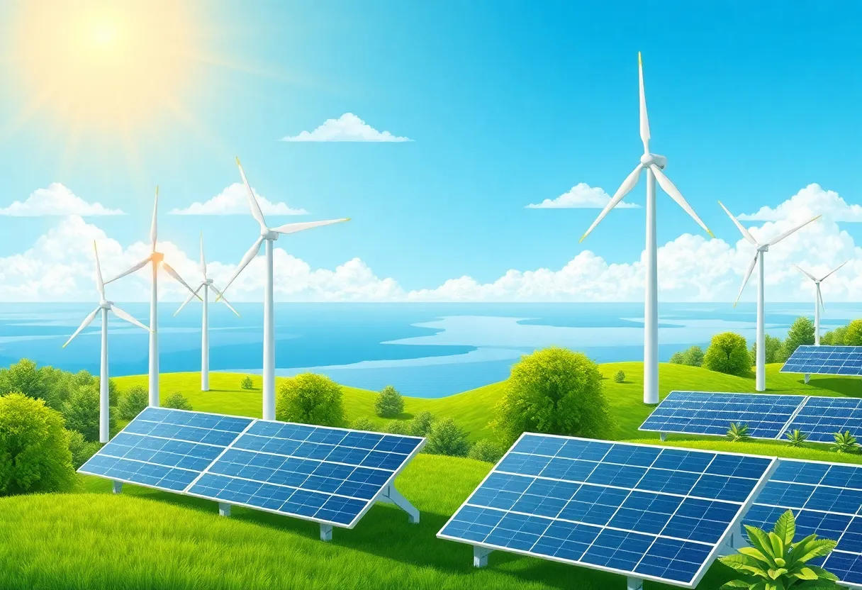 Illustration depicting renewable energy initiatives in Michigan with wind turbines and solar panels