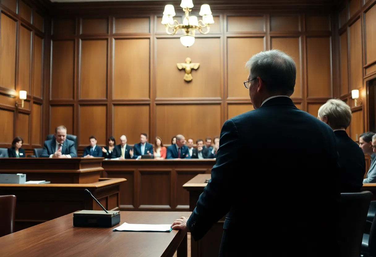 A courtroom setting during a legal trial regarding insurance fraud and arson.