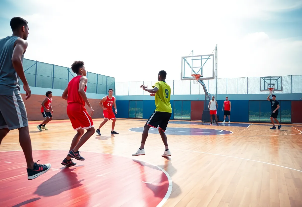 Basketball players practicing on court, showcasing teamwork.