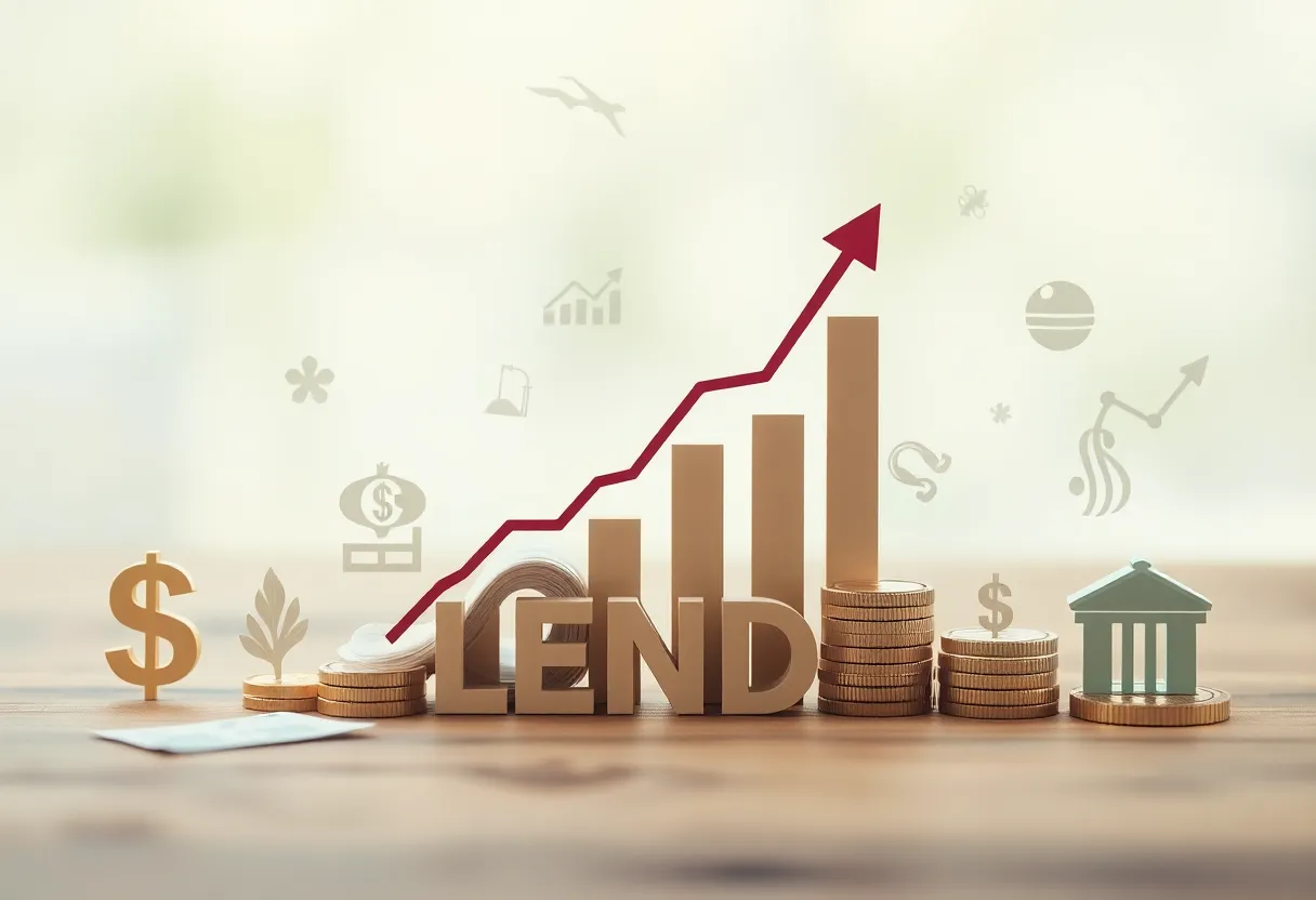 Graphic representation of economic growth with symbolic icons representing lending and banking.
