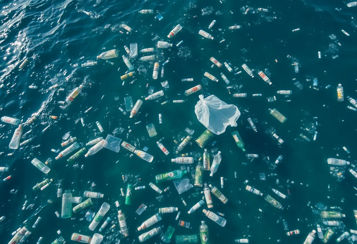 Ocean filled with plastic waste, showcasing environmental pollution