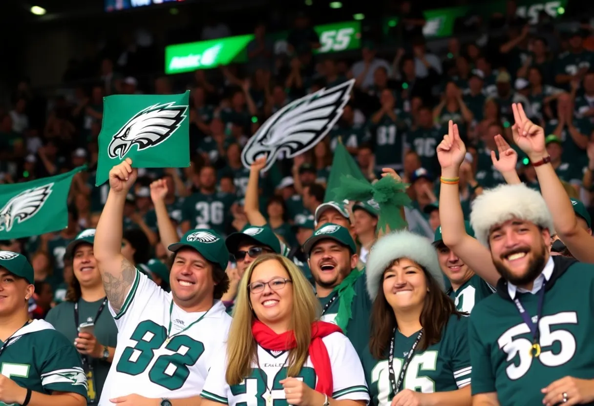 Eagles-themed celebration with fans and vibrant team colors.